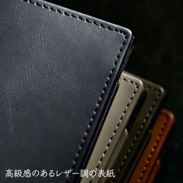 高級感のあるレザー調の表紙は縫い糸の色を表裏で変えて目立ちにくくするなど