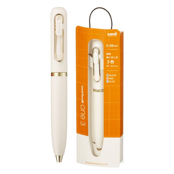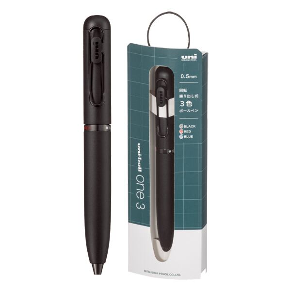黒、赤、青のスタンダードな3色を搭載し、シンプルでストレートな回転繰り出し式のボディで、手帳に合わせて使うなど持ち運びもしやすい1本となっております。丸みを帯びた短寸軸と重心を最適化する「スタビライザー機構」を採用しており、愛着の湧くデザインでありながら、安定した筆記を実現しております。