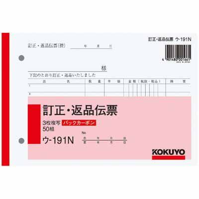 コクヨ BC複写簿 3枚訂正返品伝票 B6横 2穴80mmピッチ 7行 50組 ウ-191N