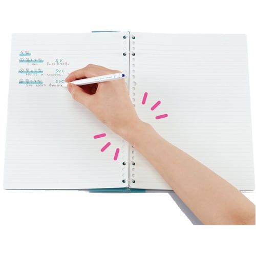 ●ルーズリーフを綴じたまま書いても綴じ具が手に当たりにくい2X2リング
